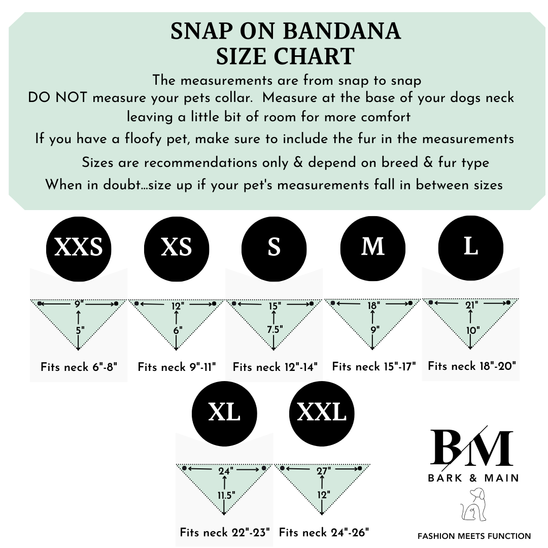 All Bandanas are designed to be folded over once before snapping. Please note that all measurements are taken from snap to snap. If you’re between sizes, we suggest sizing up.